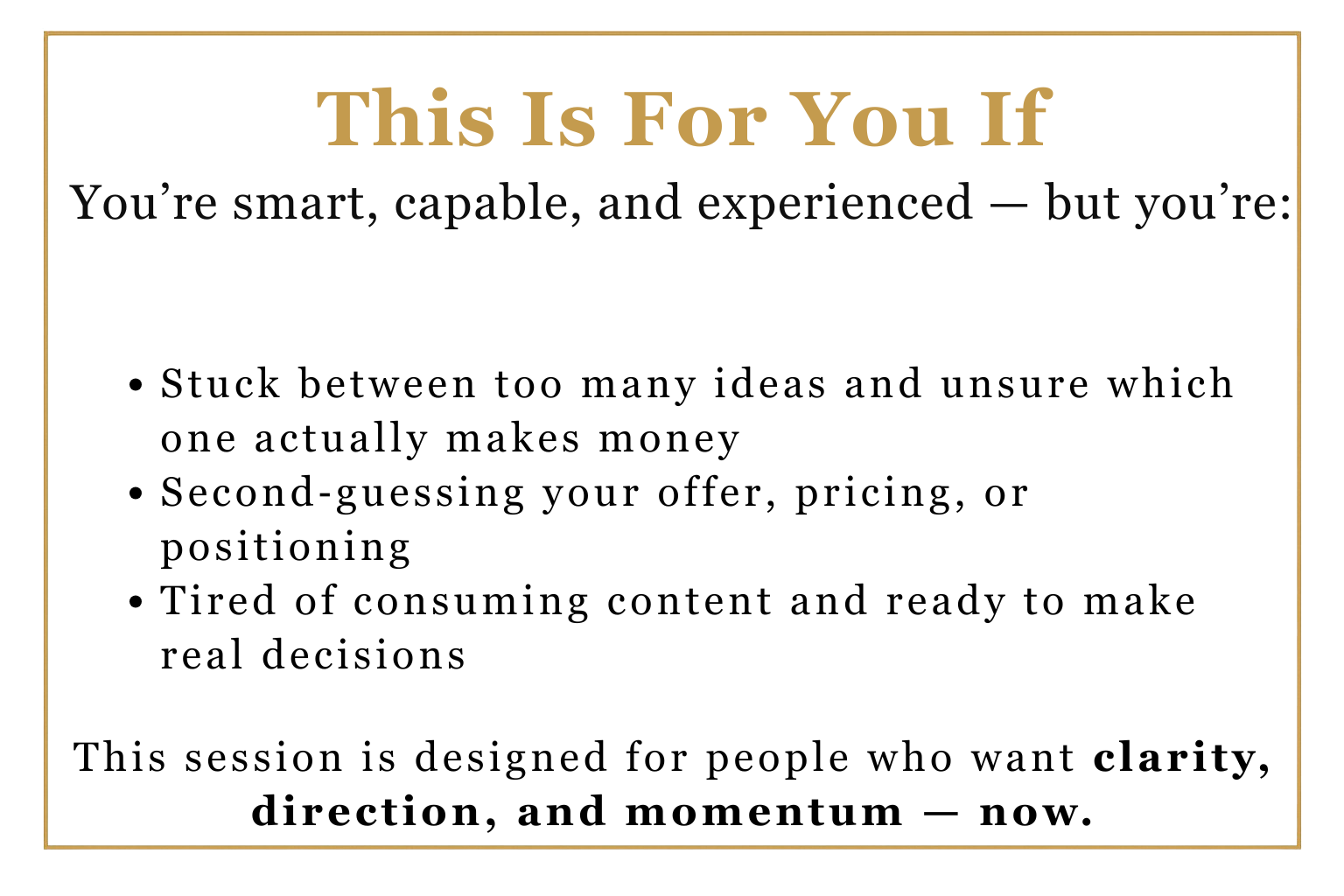 A premium clarity-to-cash session for coaches & service providers ready to stop guessing and start getting paid.
