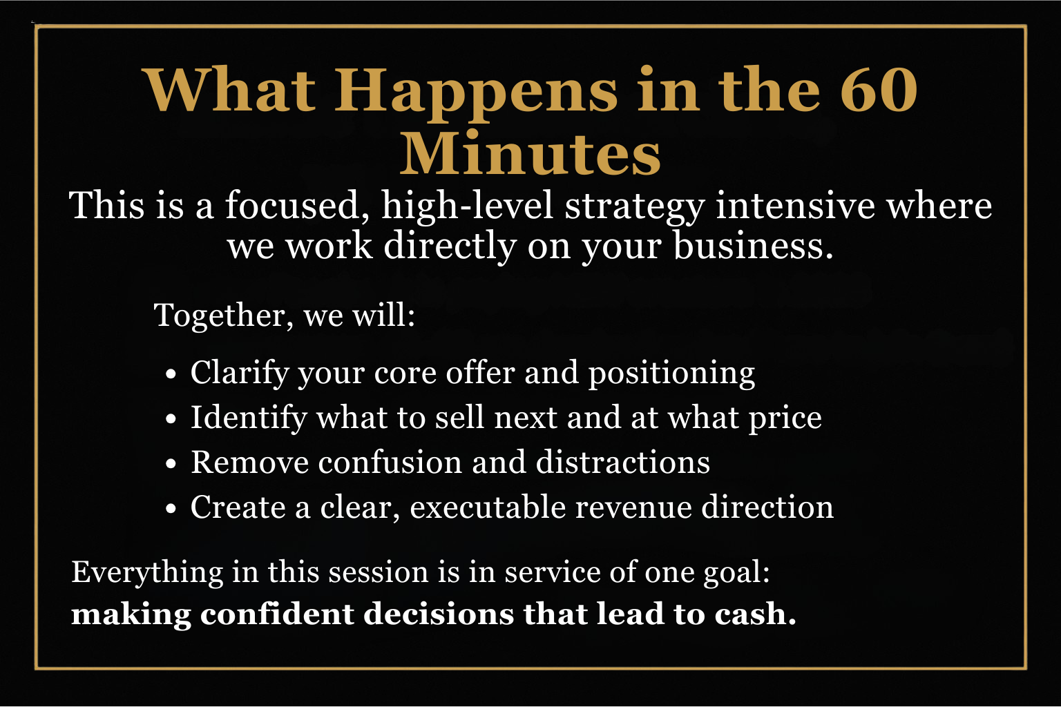 In 60 minutes, we will build your offer, pricing, messaging, and your next 30 days of content + revenue moves.